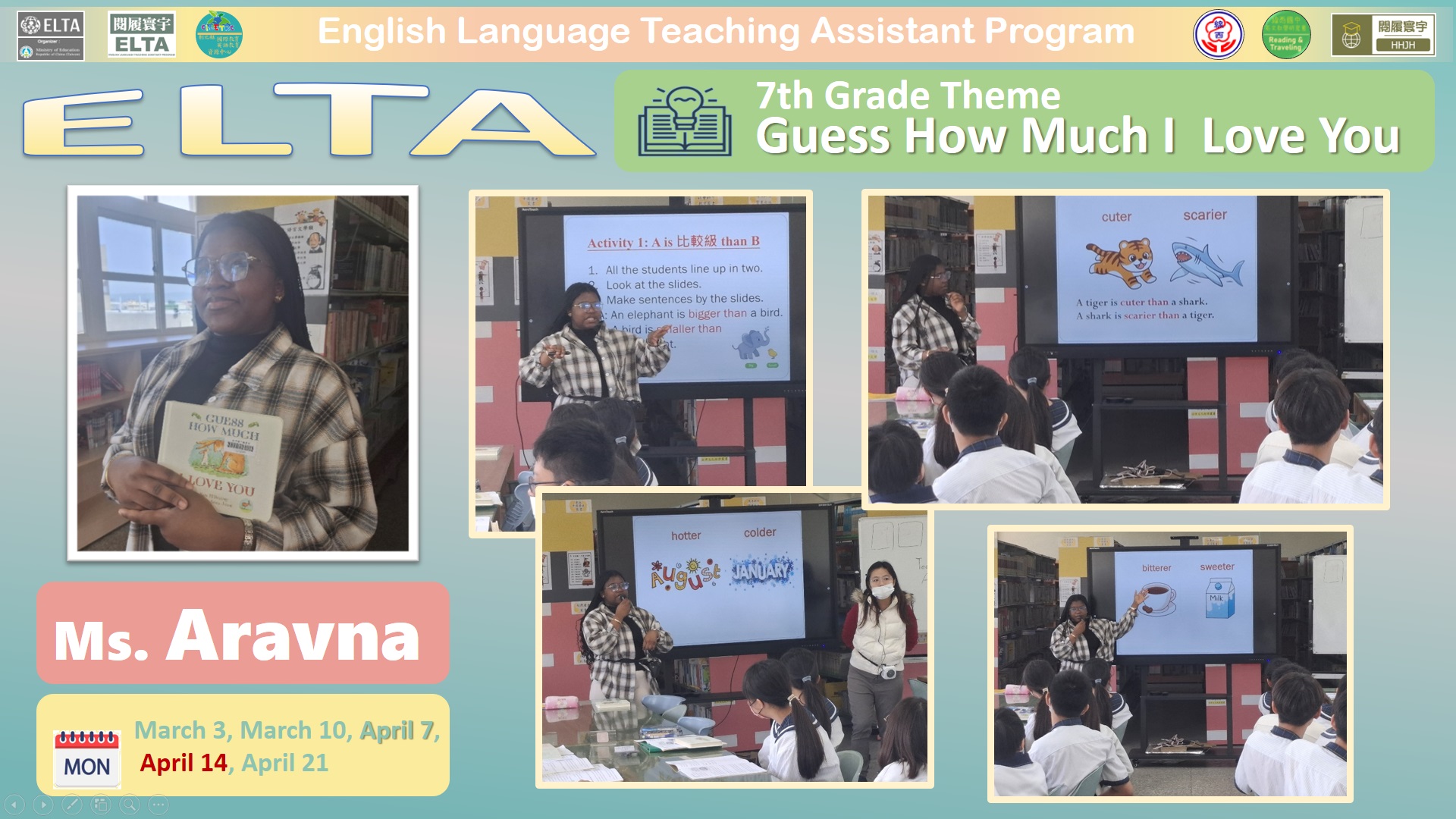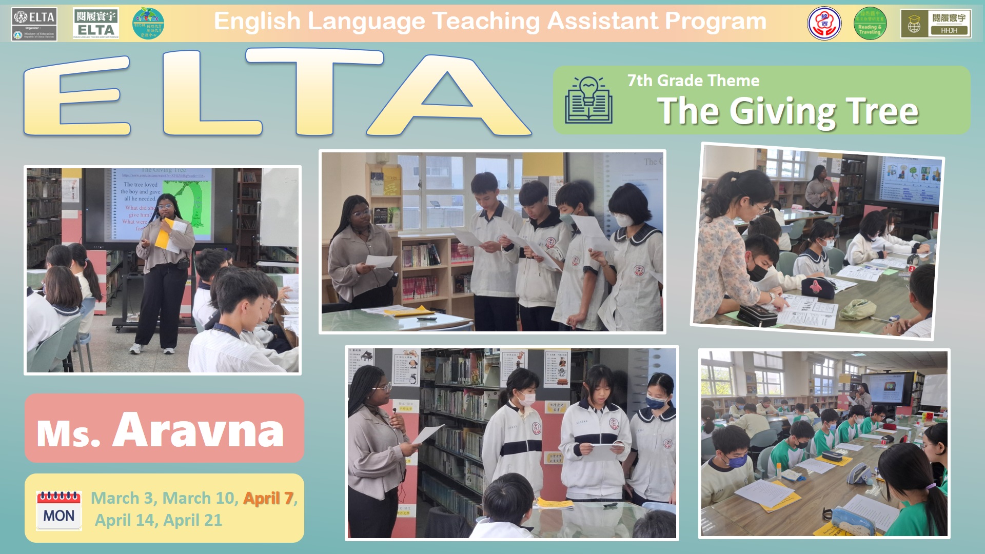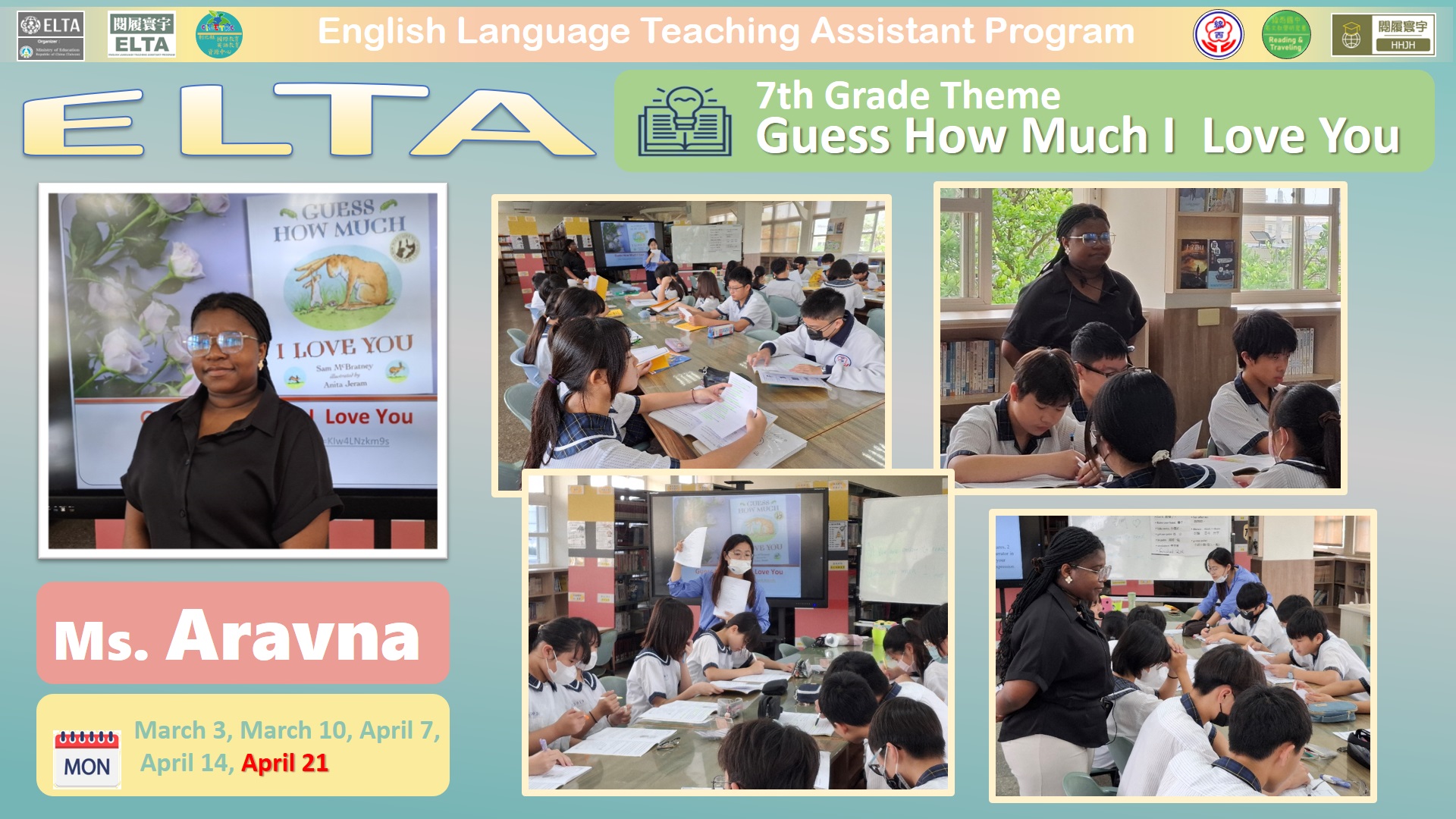 利用英語繪本概念進行課程設計,由ELTA 教師協助導引學生學習,在入班教學前將規劃領域共備時間,強化課程說明,讓ELTA 教師懂得如何教,學生學得更有英語活用感,學校亦將排課隨班教師隨班指導,注意學習態度與生活常規。