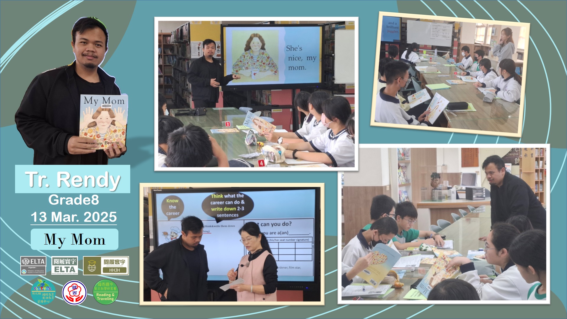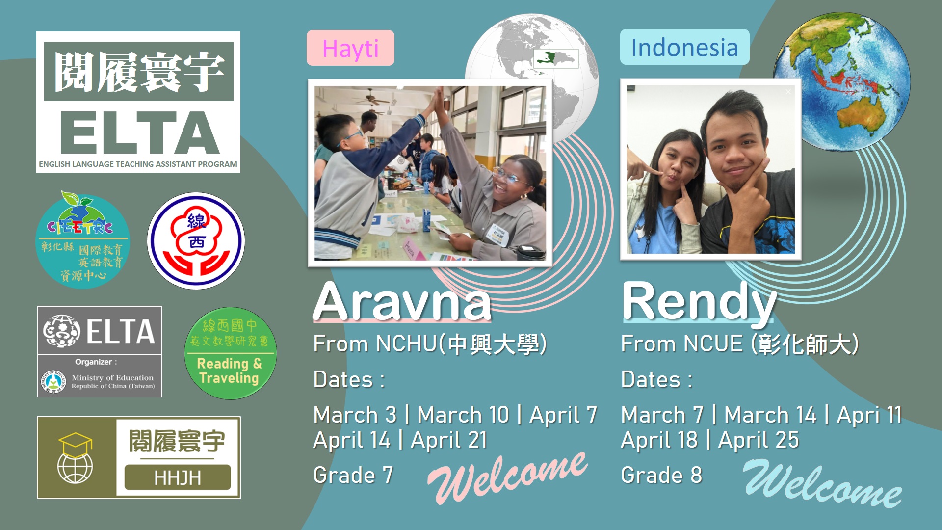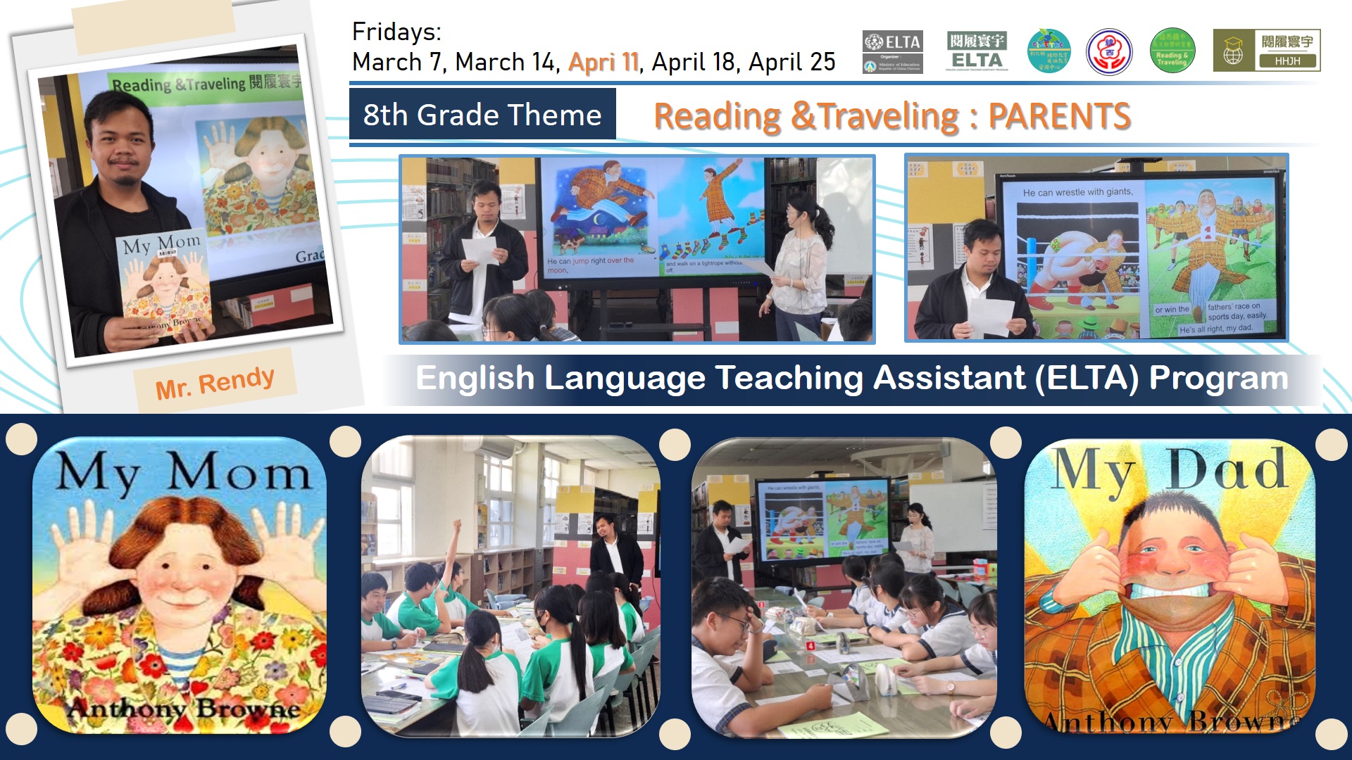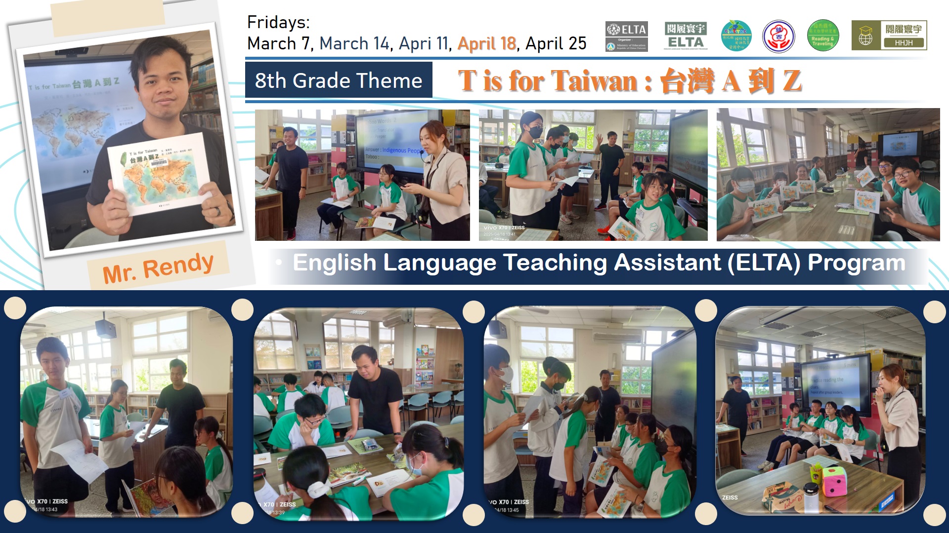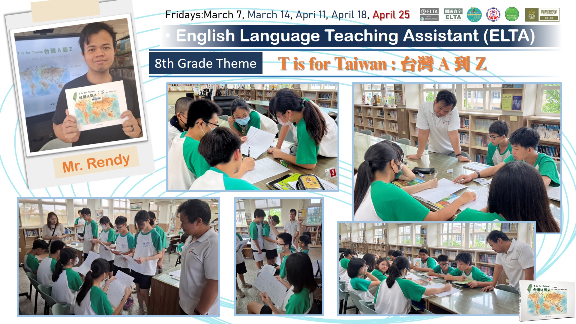 搭配彈性課程閱履寰宇,有自編教材,可供 ELTA 教師使用,校內教師協同上課。 利用英語繪本概念進行課程設計,由ELTA 教師協助導引學生學習,在入班教學前將規劃領域共備時間,強化課程說明,讓ELTA 教師懂得如何教,學生學得更有英語活用感,學校亦將排課隨班教師隨班指導,注意學習態度與生活常規。