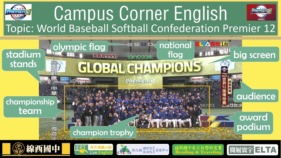 搭配台灣隊12強冠軍,校園雙語呼應建置,討論時事、學習雙語