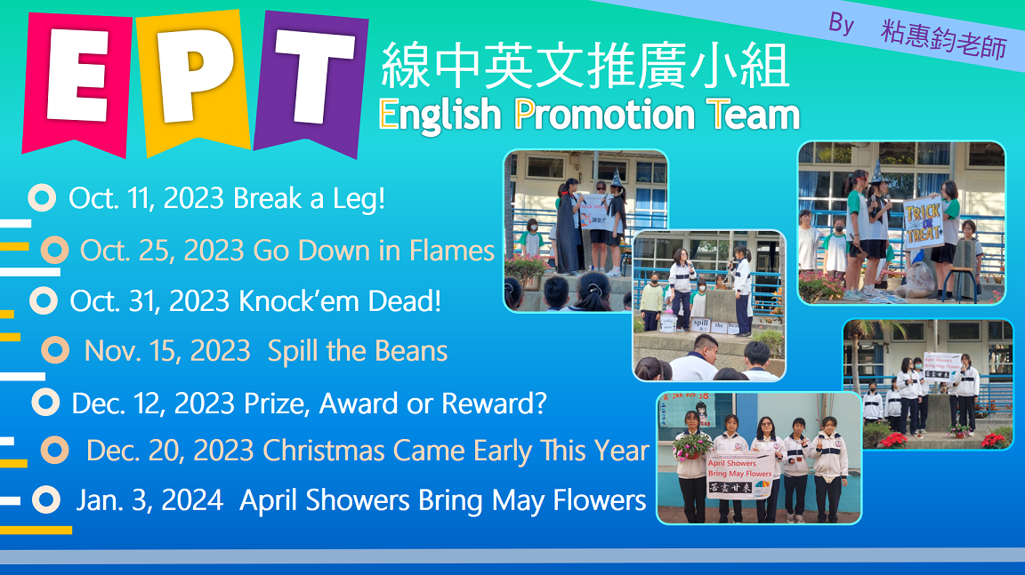 英文推廣小組在2023年10月到2024年1月期間舉辦的一系列英文活動。這些活動的標題包括了一些常用的英文慣用語,例如「Break a Leg!」和「Spill the Beans」。其中也包含了一個關於詞彙辨析的主題以及一些與節慶相關的表達。這份列表提供了一個關於該小組推廣英語學習的具體時間表和內容概覽。