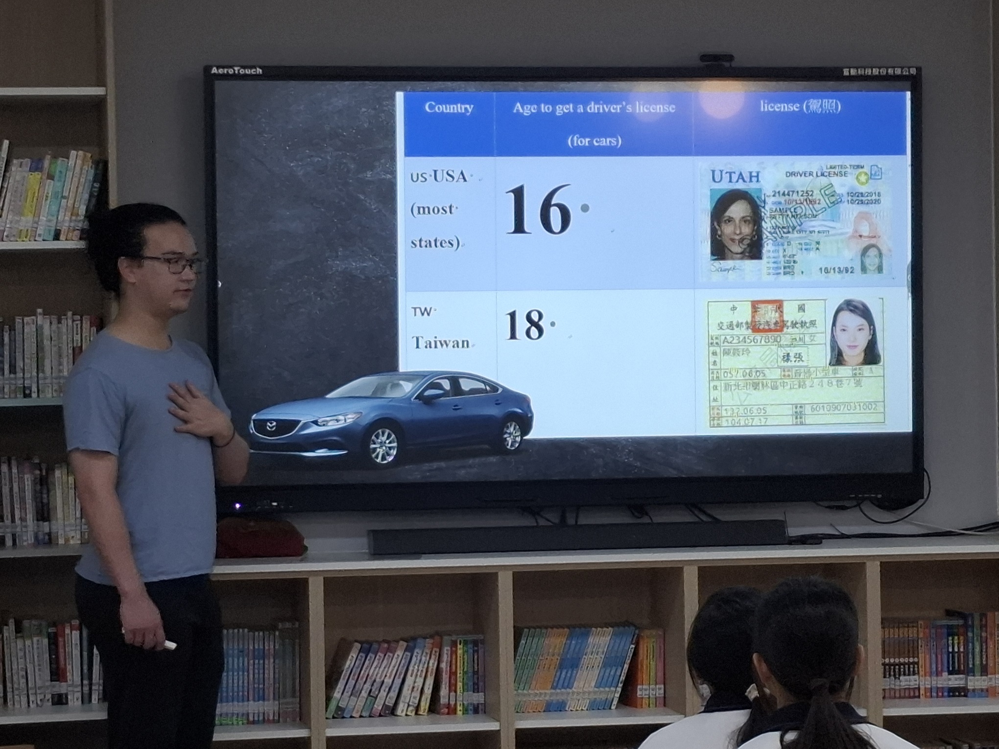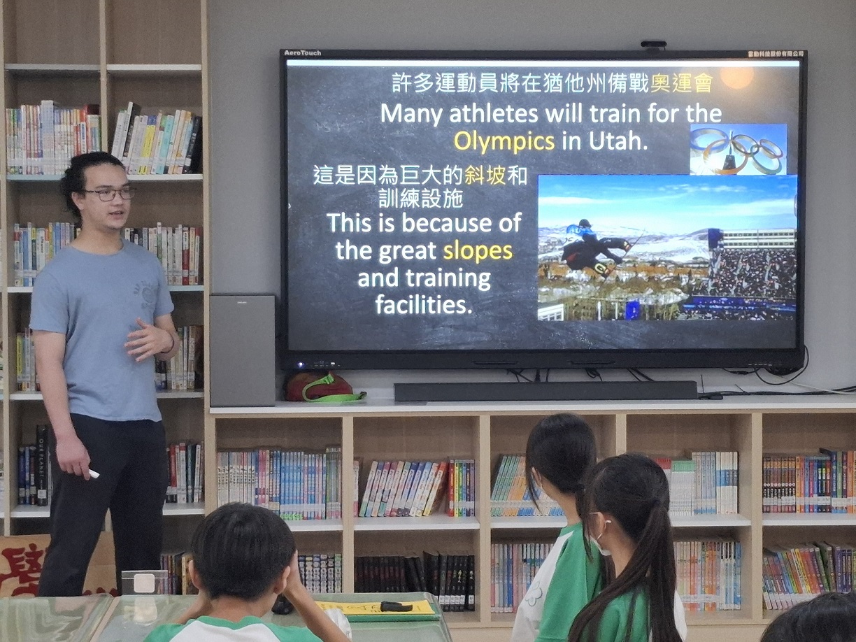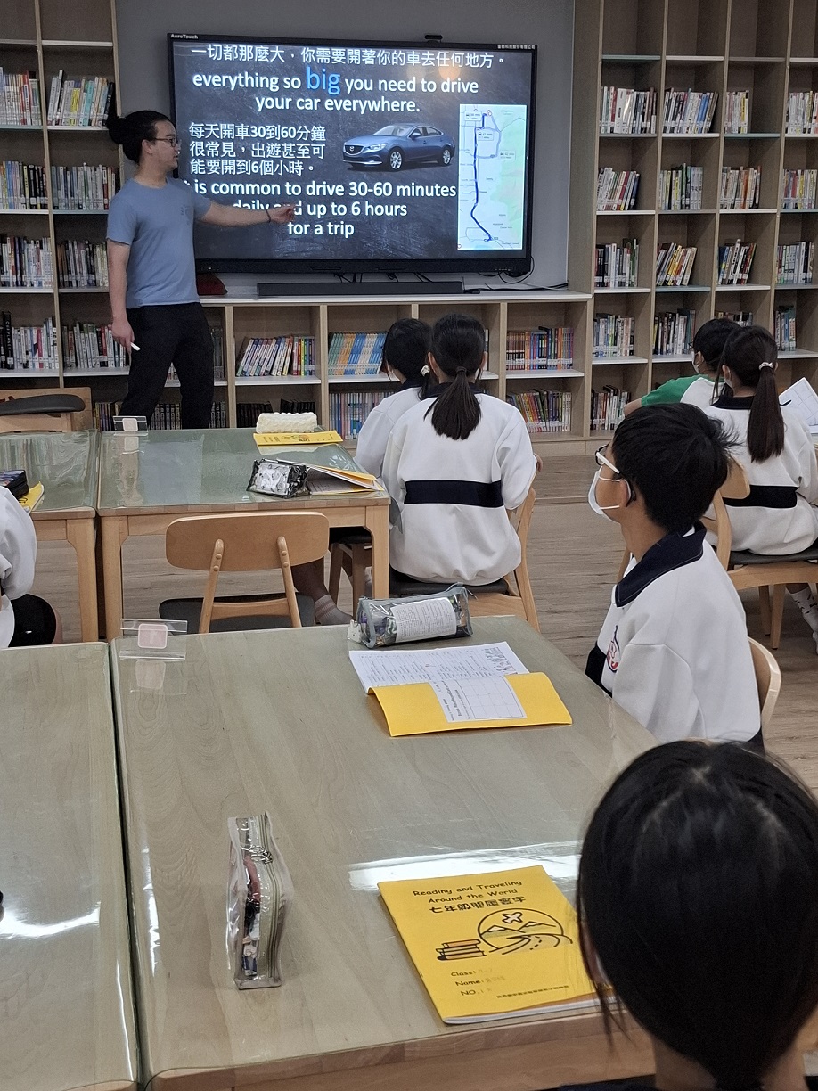 七年級彈性課程閱履寰宇Reading & traveling 113學年度下學期由英文領域教師與國際志工Loren Burtt 共備討論帶領學生感受國際教育與雙語互動 Loren介紹他自己成長環境下的美國