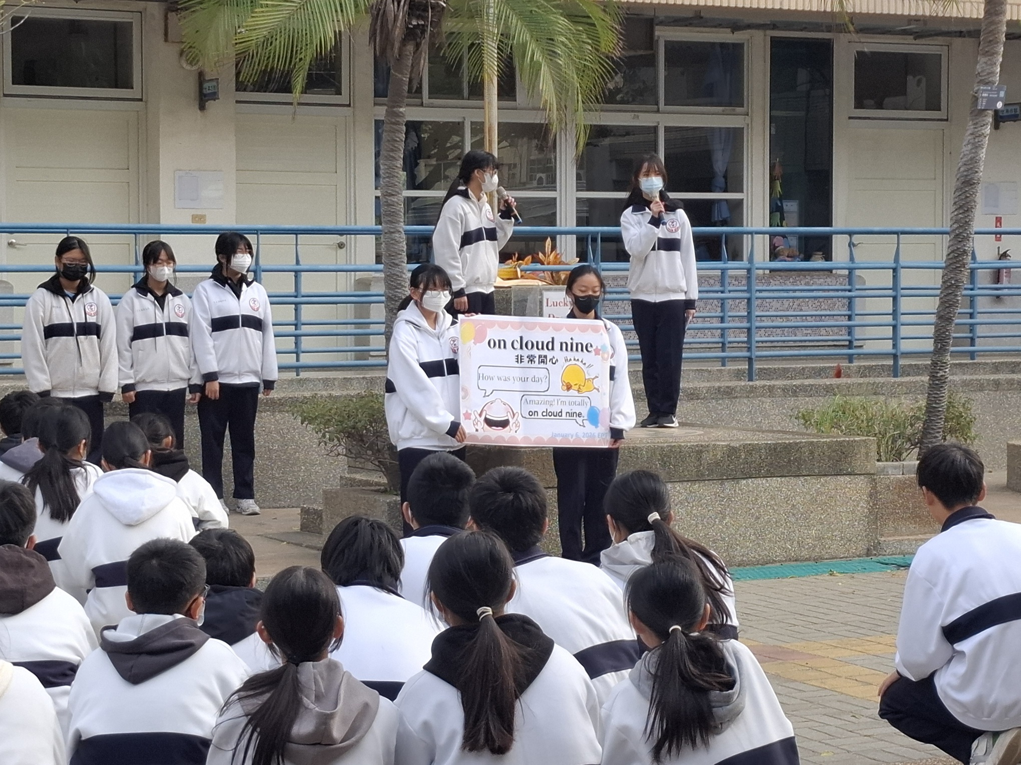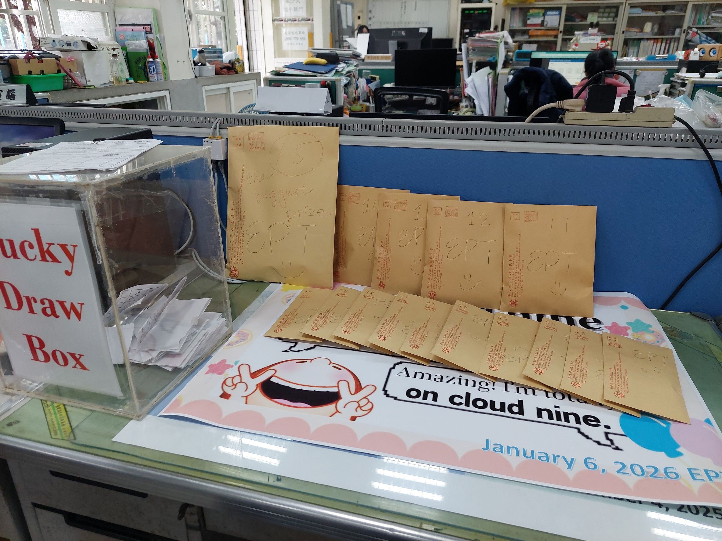 EPT英文推廣小組Live English 2026/1/7「on cloud nine」非常開心 801王宥云Yuri、林沂霈Elaine 指導教師:粘惠鈞老師Mina 期末總結進行抽獎活動Lucky Draw