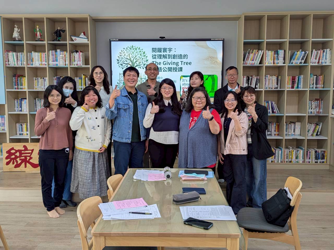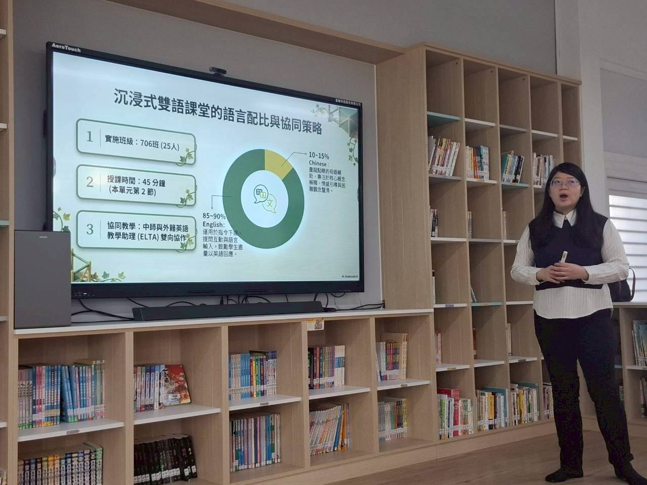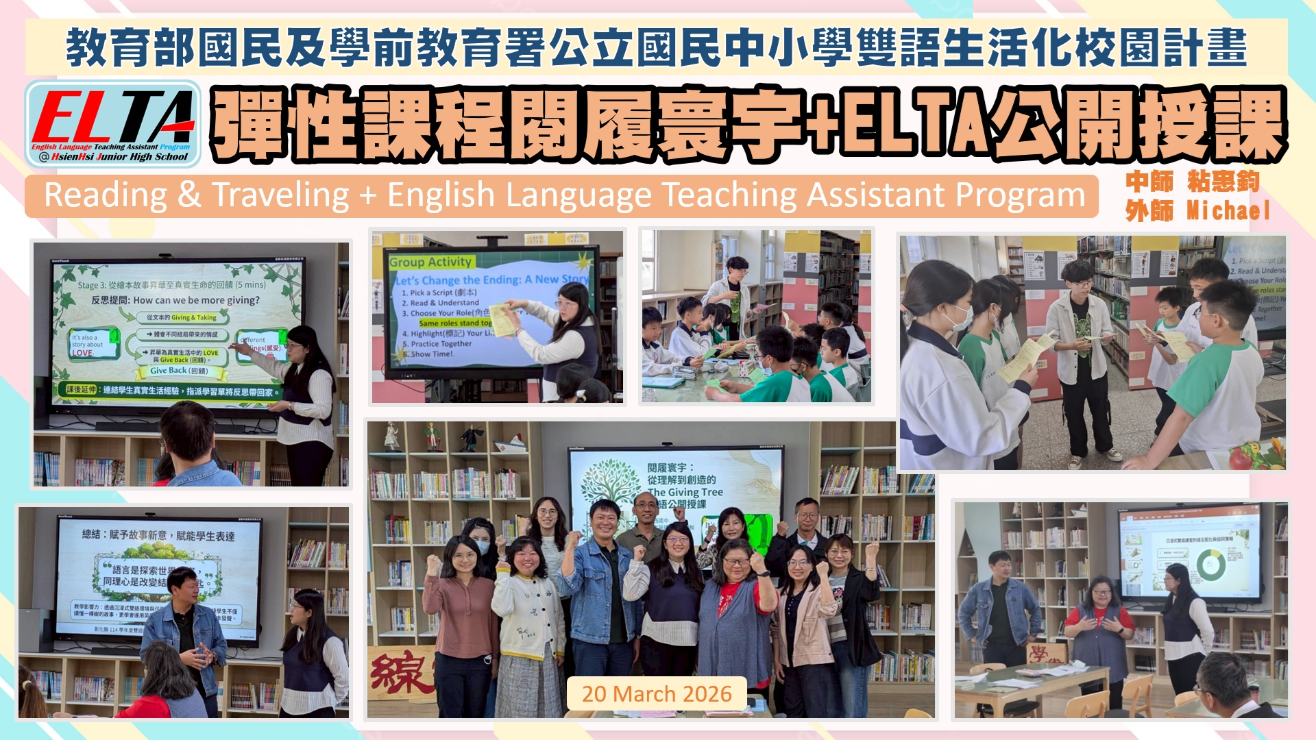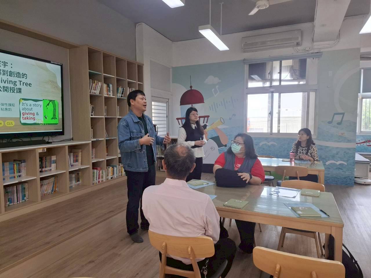 雙語生活化校園計畫縣級公開觀課,由本縣英資中心邀請教授到校指導,將學校閱履寰宇雙語繪本課程,實際操作並邀請各校英語教師蒞校一同參與,從說課、觀課、議課,一起觀察與討論,透過集體智慧,確保每一位學生在課堂中都能獲得有意義的學習。線中推動素養導向教學、雙語教育或數位融入教學,公開觀課是最佳的實踐場域。 本課堂設計:1.前置沉浸式閱讀、2.課堂教師協同讀者劇場、3.繪本主題說明、4.字彙認識與練習、5.學生小短劇、6.教師引導與說明、7.課堂複習與回饋、8.完成閱履寰宇學習手冊。 公開觀課/中師:粘惠鈞老師、外師/Michael