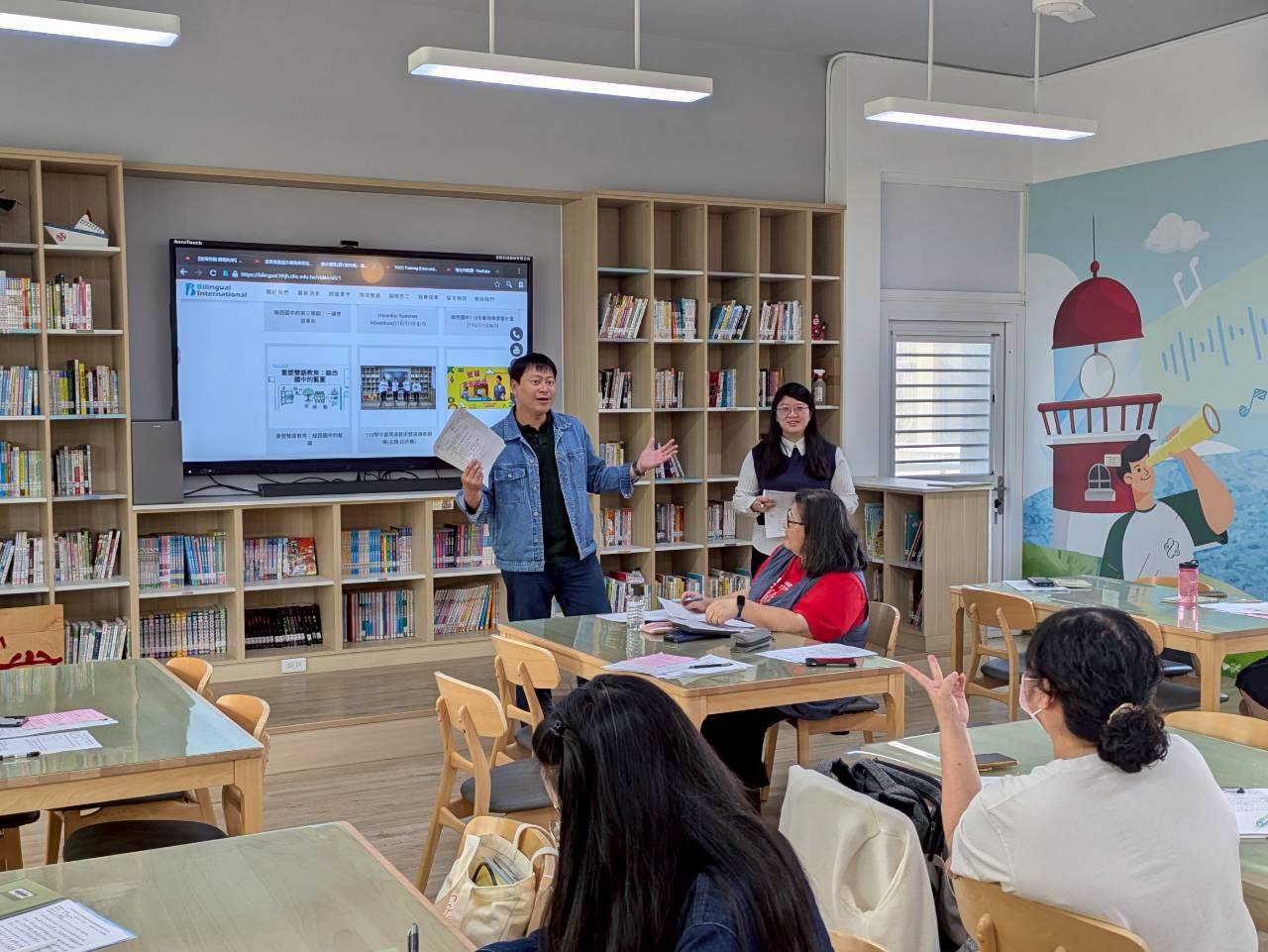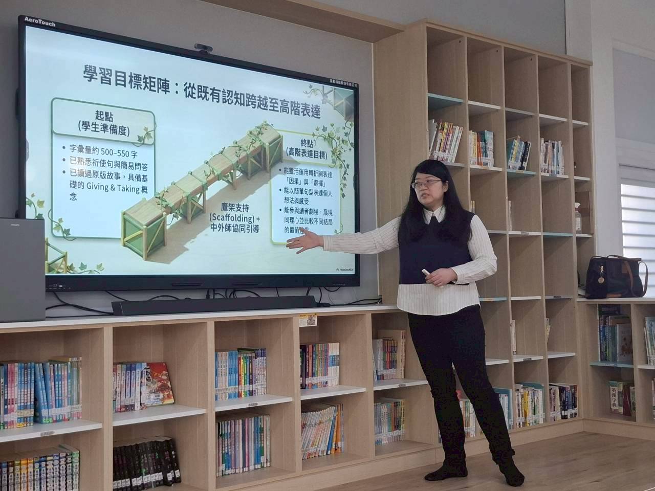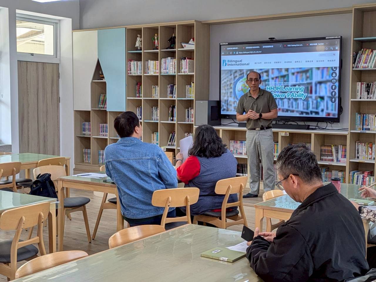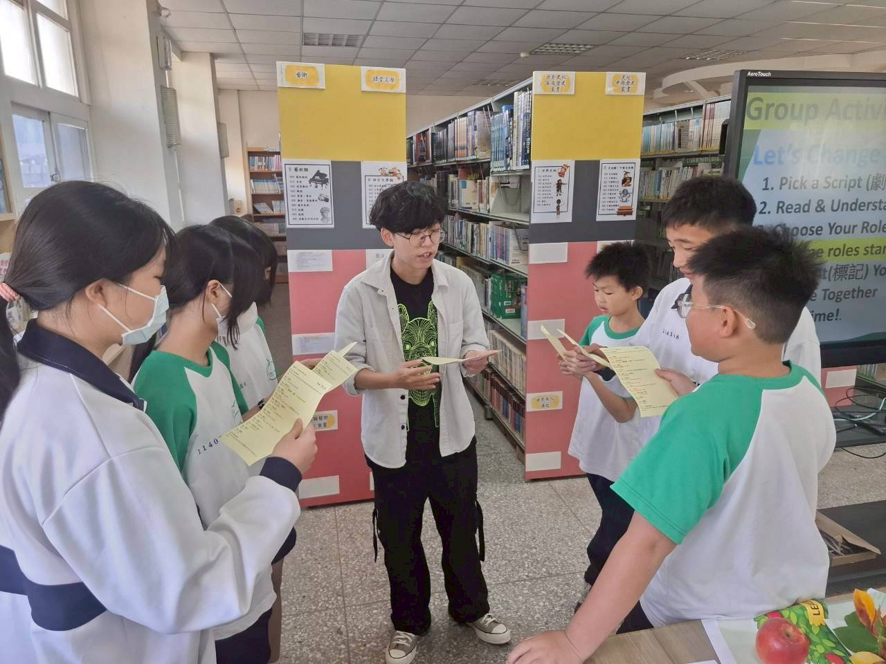 雙語生活化校園計畫縣級公開觀課,由本縣英資中心邀請教授到校指導,將學校閱履寰宇雙語繪本課程,實際操作並邀請各校英語教師蒞校一同參與,從說課、觀課、議課,一起觀察與討論,透過集體智慧,確保每一位學生在課堂中都能獲得有意義的學習。線中推動素養導向教學、雙語教育或數位融入教學,公開觀課是最佳的實踐場域。 本課堂設計:1.前置沉浸式閱讀、2.課堂教師協同讀者劇場、3.繪本主題說明、4.字彙認識與練習、5.學生小短劇、6.教師引導與說明、7.課堂複習與回饋、8.完成閱履寰宇學習手冊。 公開觀課/中師:粘惠鈞老師、外師/Michael