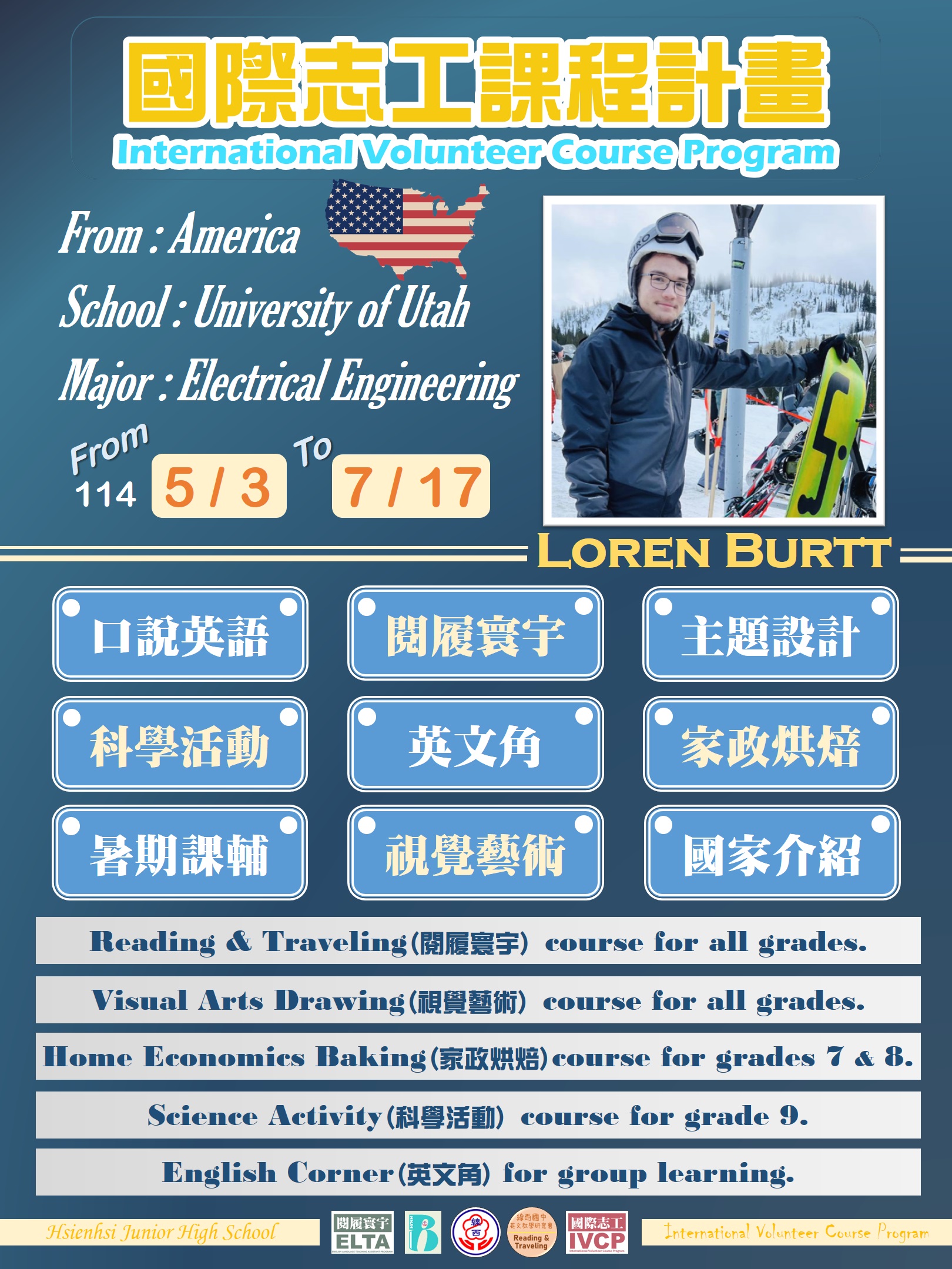 【國際教育學生學習目標】 一、透過活動接觸國際人士,觸發學習不同文化的意願。 二、參與活動學生能用英語進行校園介紹及與國際志工進行互動。 三、利用課程了解我國與世界其他國家的文化特質及國情差異。 四、參與活動學生能建立國際觀,學習自然使用英語對話,並完成學習感想。 五、提升學生英語溝通表達能力及用英文介紹自己文化的能力。 六、運用多元方式參與學校的國際文化活動,學習主動性與口說練習。