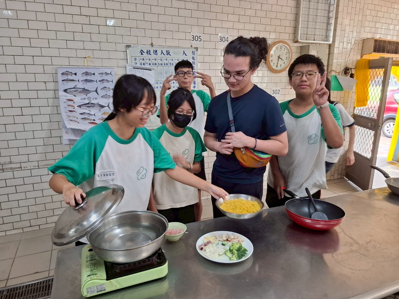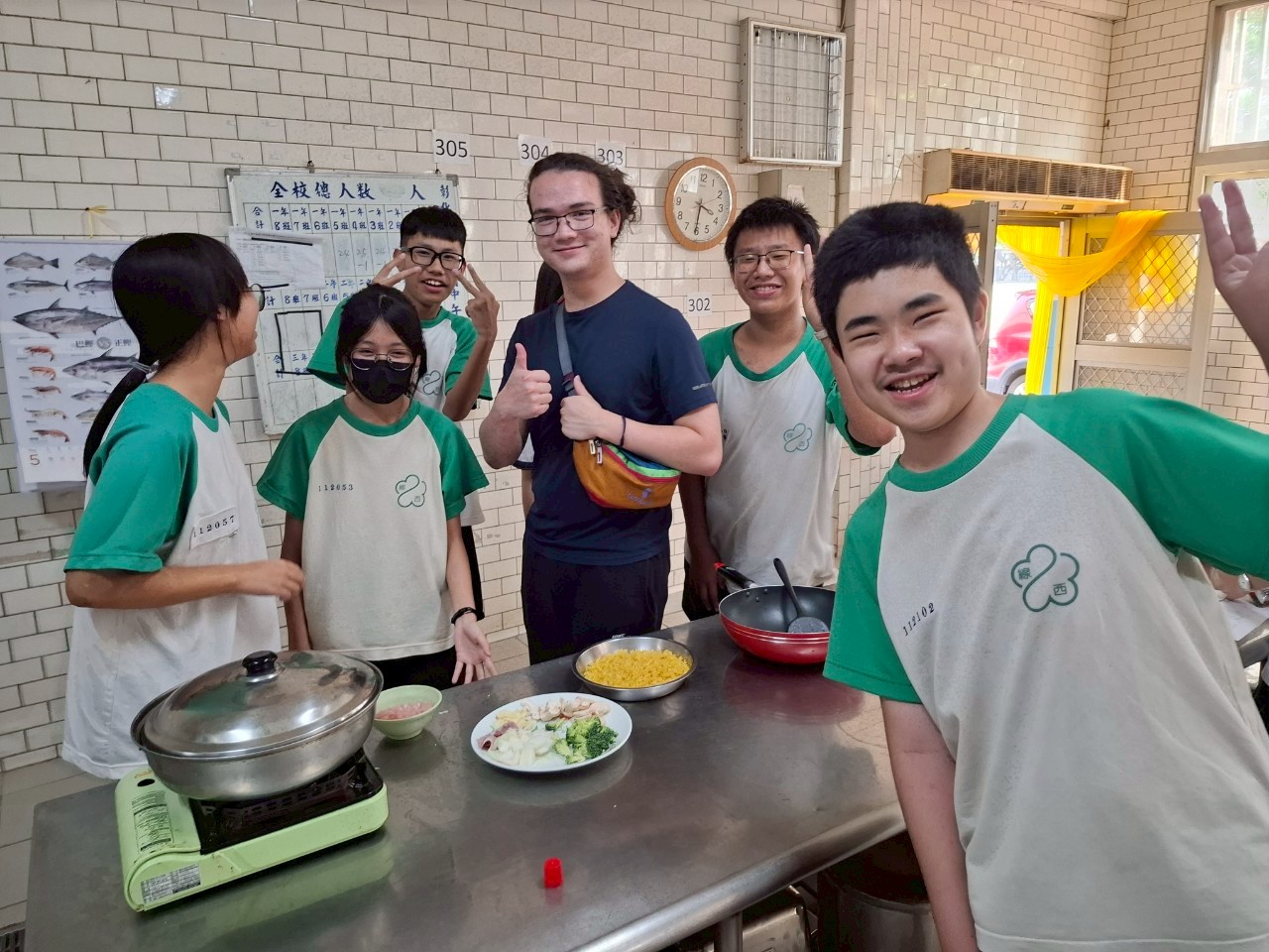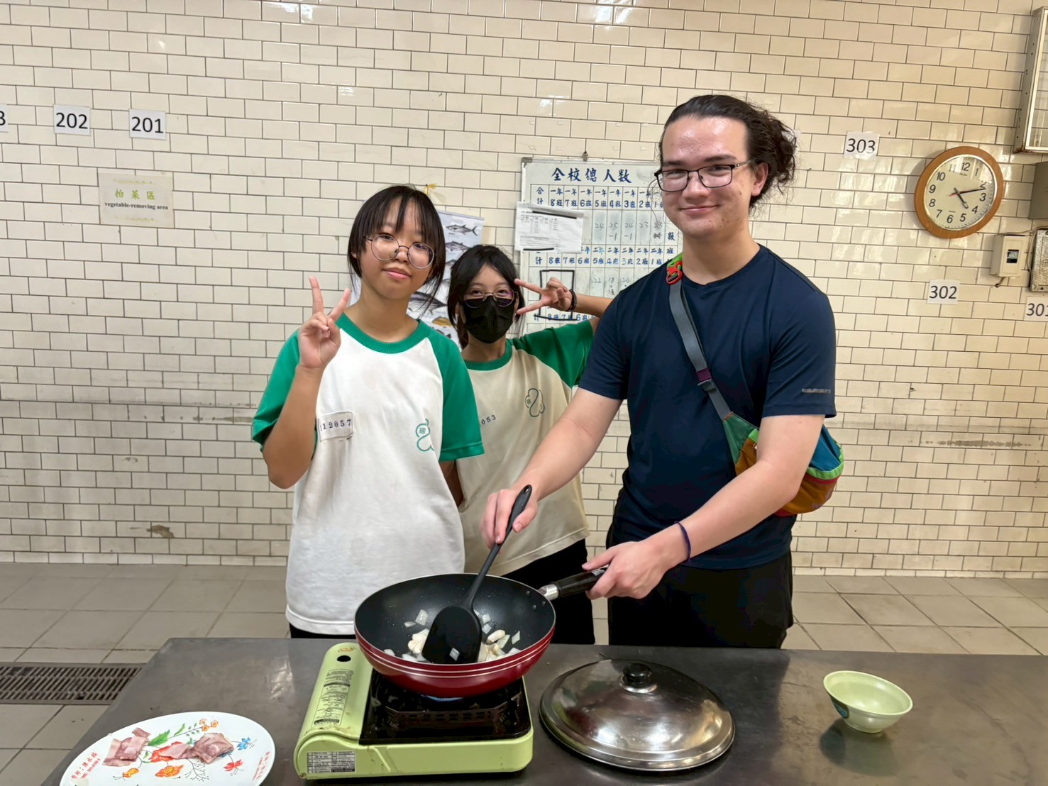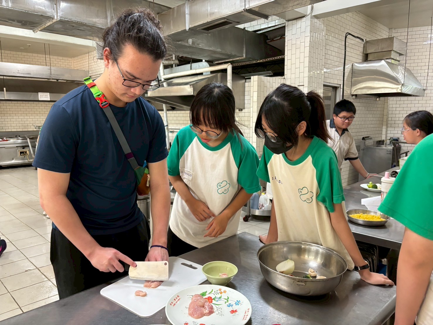 Loren, who loves cooking, quickly picked up the knife and helped the students cut vegetables and meat for cooking. The students also happily took photos with Loren.