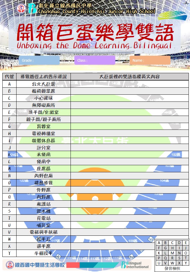 | 雙語教育 | 實際應用英文: 學生在實際情境中接觸並使用雙語,將提升英語聽說讀寫的應用。 增加學習興趣: 跳脫制式化課堂,透過實地走訪、互動學習單,學習更生動有趣。 跨文化與國際視野: 認識國際級場館設施與體育文化,增強國際視野與跨文化理解。 培養批判性思考: 在雙語環境中探索、解決問題,提升批判性思考能力。 提升專業詞彙: 學習與體育場館、設施相關的專業英文詞彙 (如:救護站、無障礙空間等)。 |
