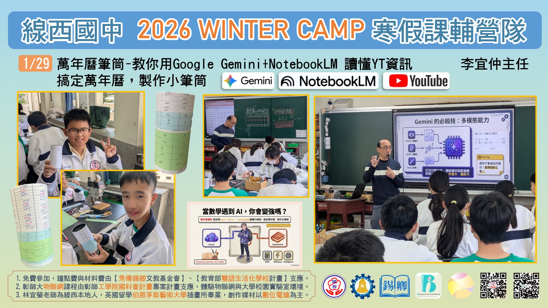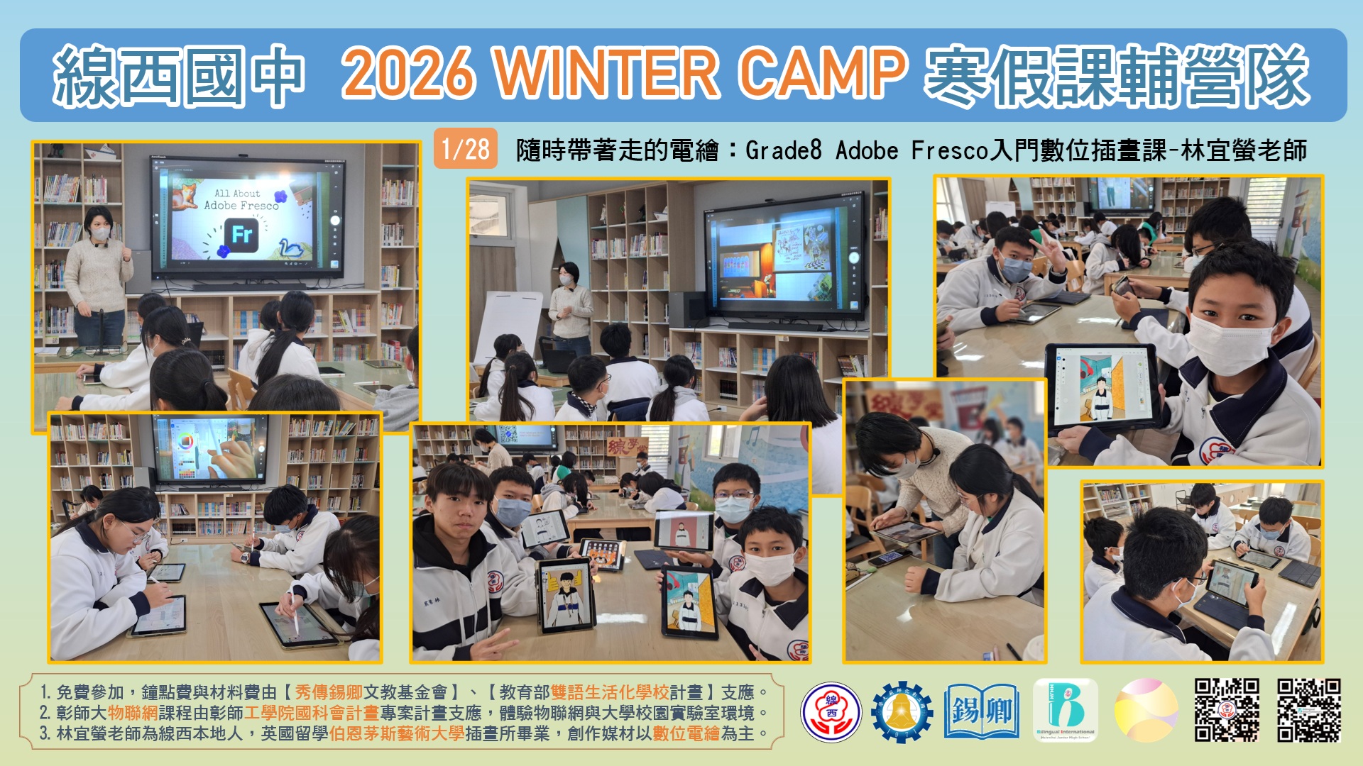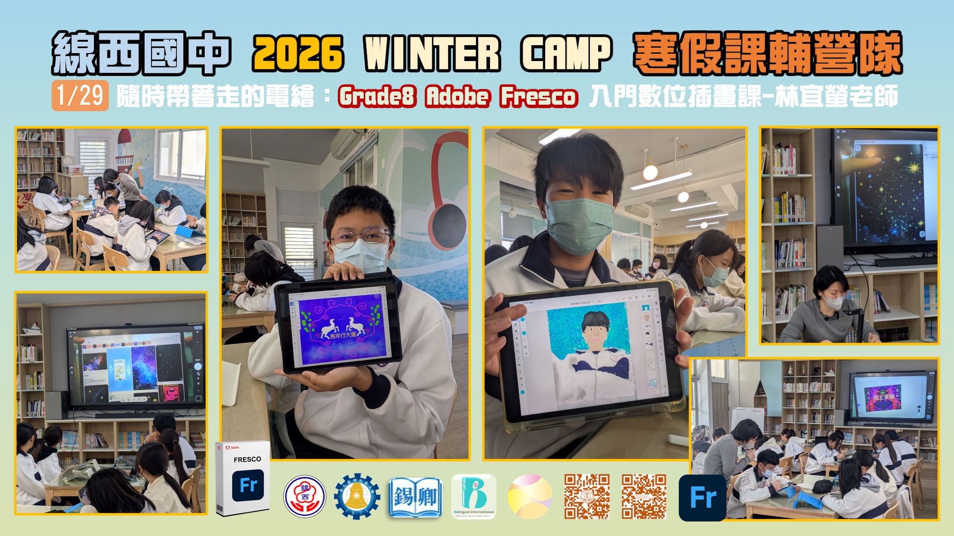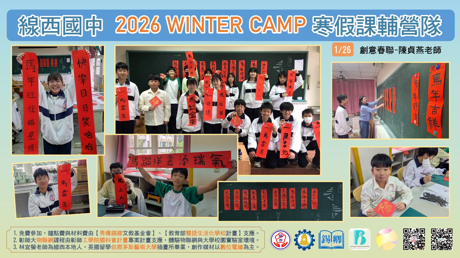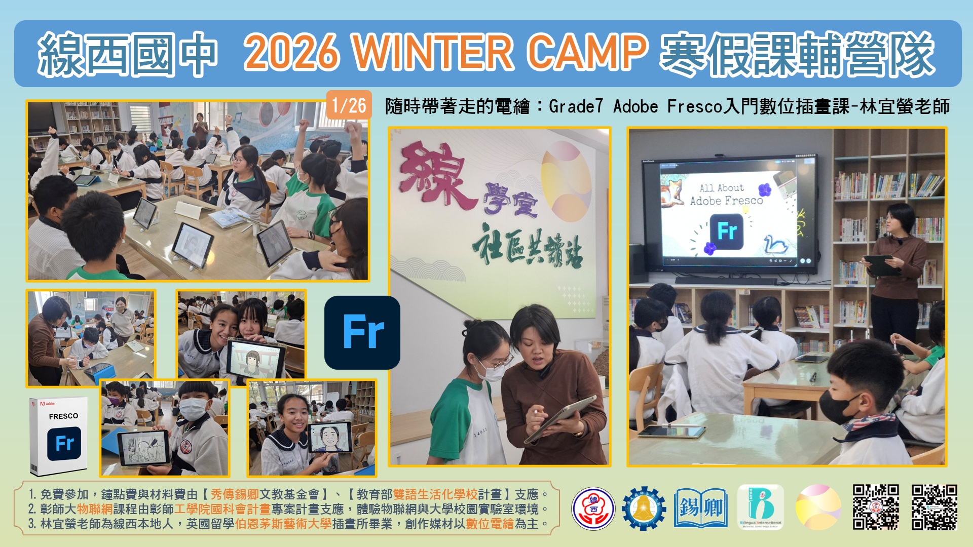 1.寒假課輔免費參加,鐘點費與材料費由【秀傳錫卿文教基金會】、【教育部雙語生活化學校計畫】支應。 2.彰師大物聯網課程由彰師工學院國科會計畫專案計畫支應,體驗物聯網與大學校園實驗室環境。 3.林宜螢老師為線西本地人,英國伯恩茅斯藝術大學插畫所畢業,創作媒材以電繪為主。 4.多項課程帶入雙語內容,讓學生學習認知各項專業知識,也感受雙語教學環境。 精彩成果展現