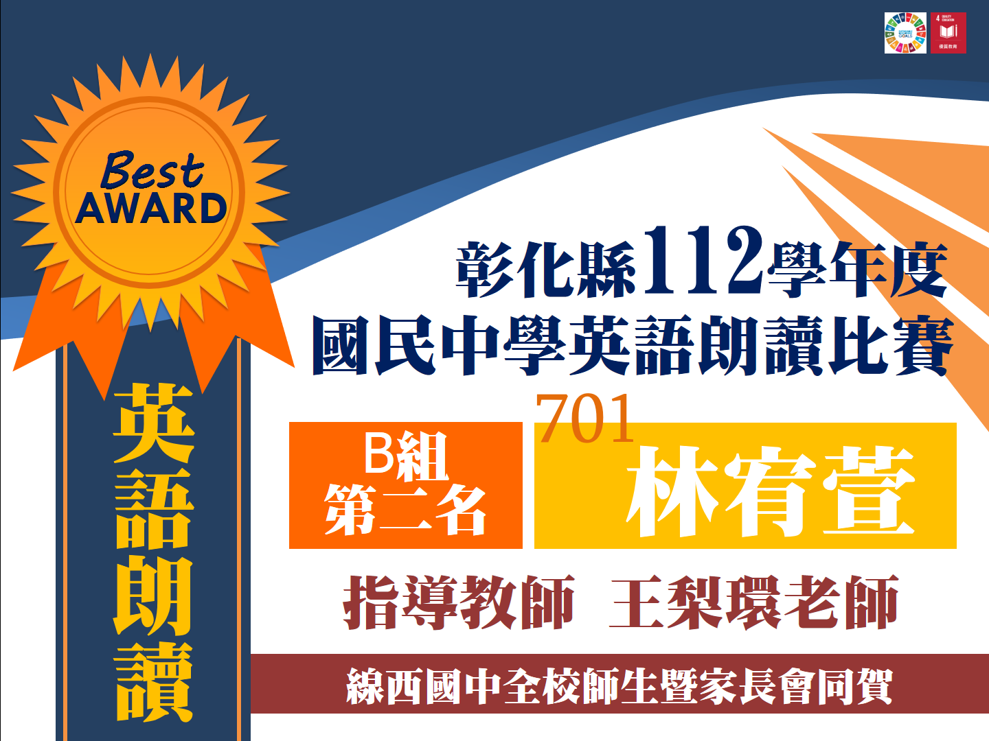 彰化縣113學年度國民中學英語朗讀B組第三名