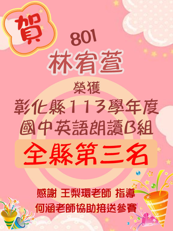 彰化縣113學年度國民中學英語朗讀B組第三名
